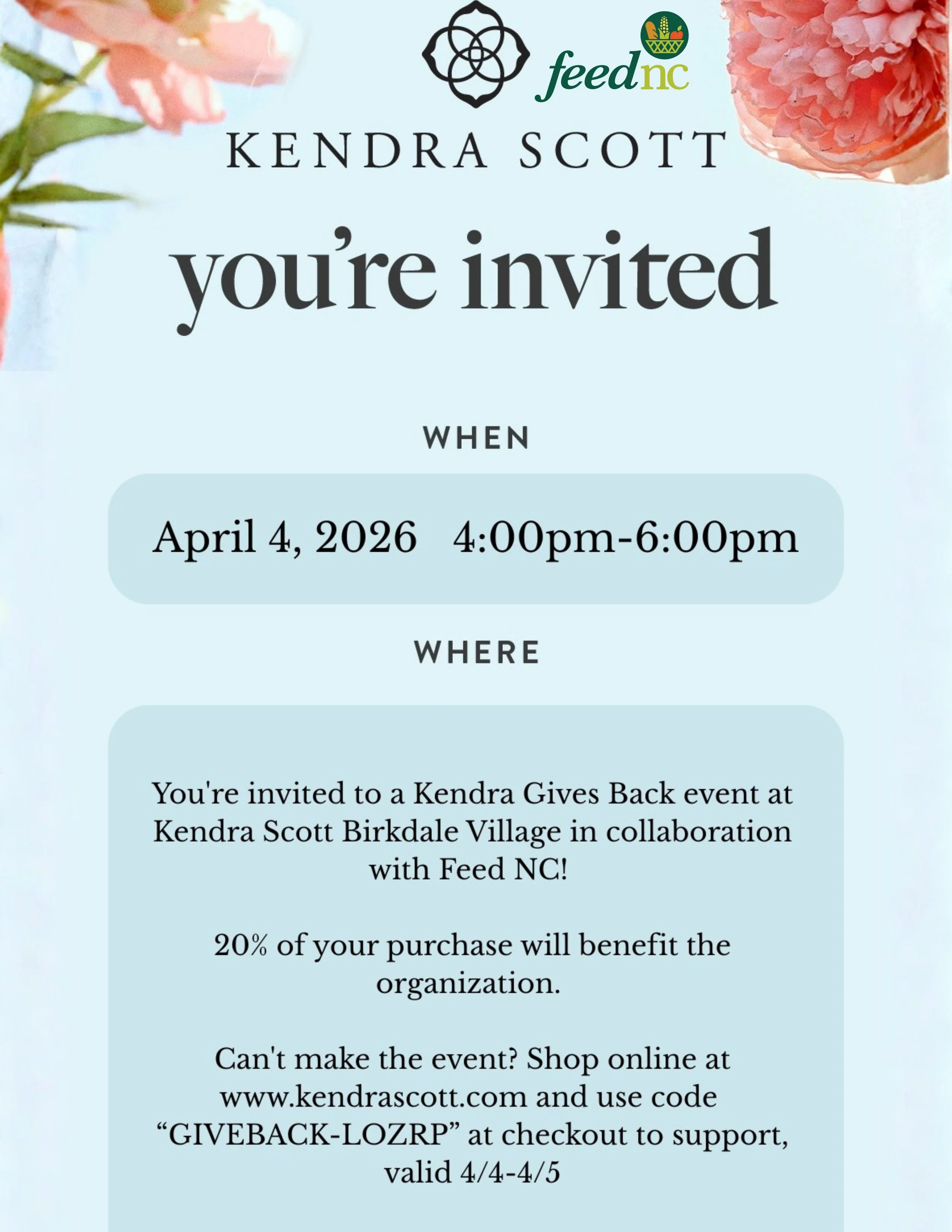 Join us for a special Kendra Gives Back shopping event in support of FeedNC on April 4 from 4:00–6:00 PM at Kendra Scott in Birkdale Village.